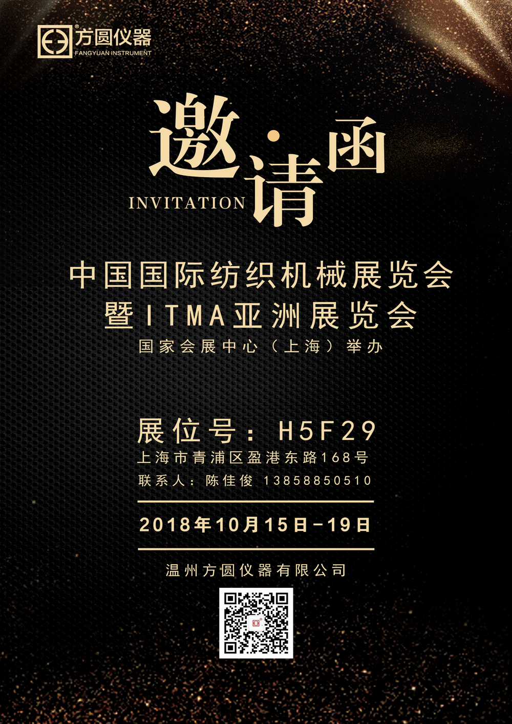 2018年中國國際紡織機械展覽會暨ITMA亞洲展覽會將于2018年10月15日-19日在國家會展中心(上海)舉辦,熱忱歡迎各位紡織人士蒞臨指導,共話紡織未來。展位號:H5F29; 地址:上海市青浦區(qū)盈港東路168號;聯(lián)系人:陳佳俊(13858850510)